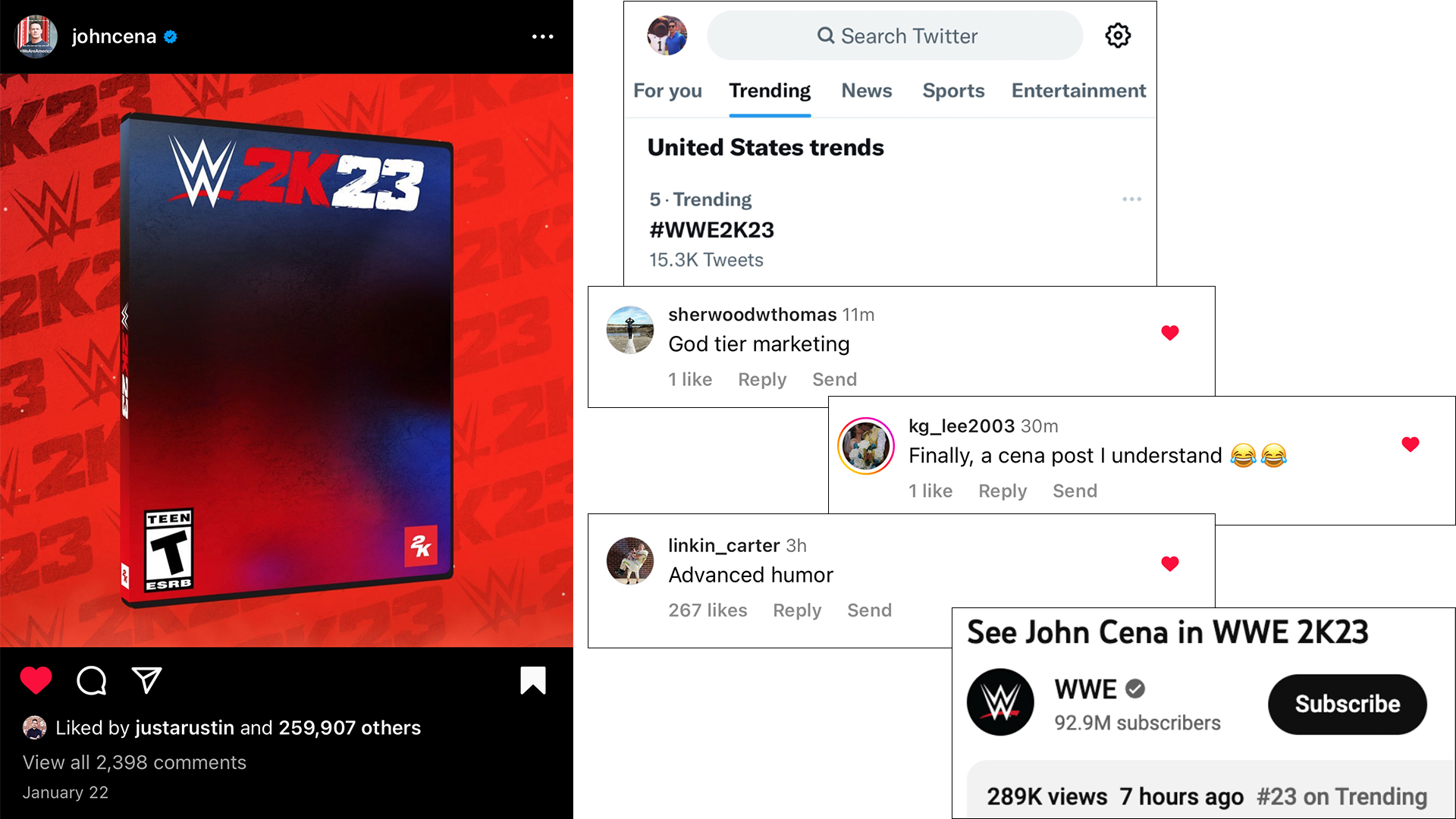 We kicked off the campaign with a blank cover reveal supported by invisible John Cena social posts from our WWE Superstars, before revealing John Cena, and the official cover art, in a social spot with Bad Bunny.